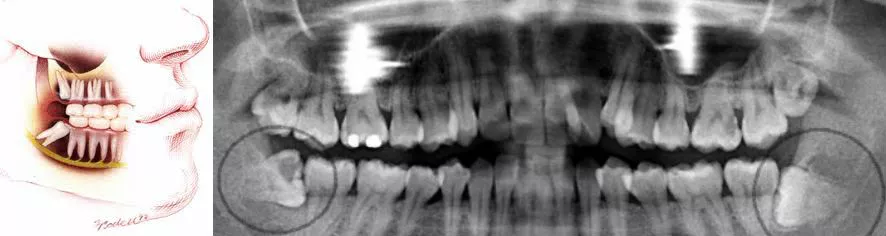 Wisdom teeth become a problem as they begin to grow most commonly in patients that do not have enough space at the rear of the jaw to fit them. If this happens, the teeth become wedged in behind the tooth in front (impacted). Impacted wisdom teeth can cause a variety of problems including infection, pain, damage to nearby molars, and food packing which can then lead to decay.